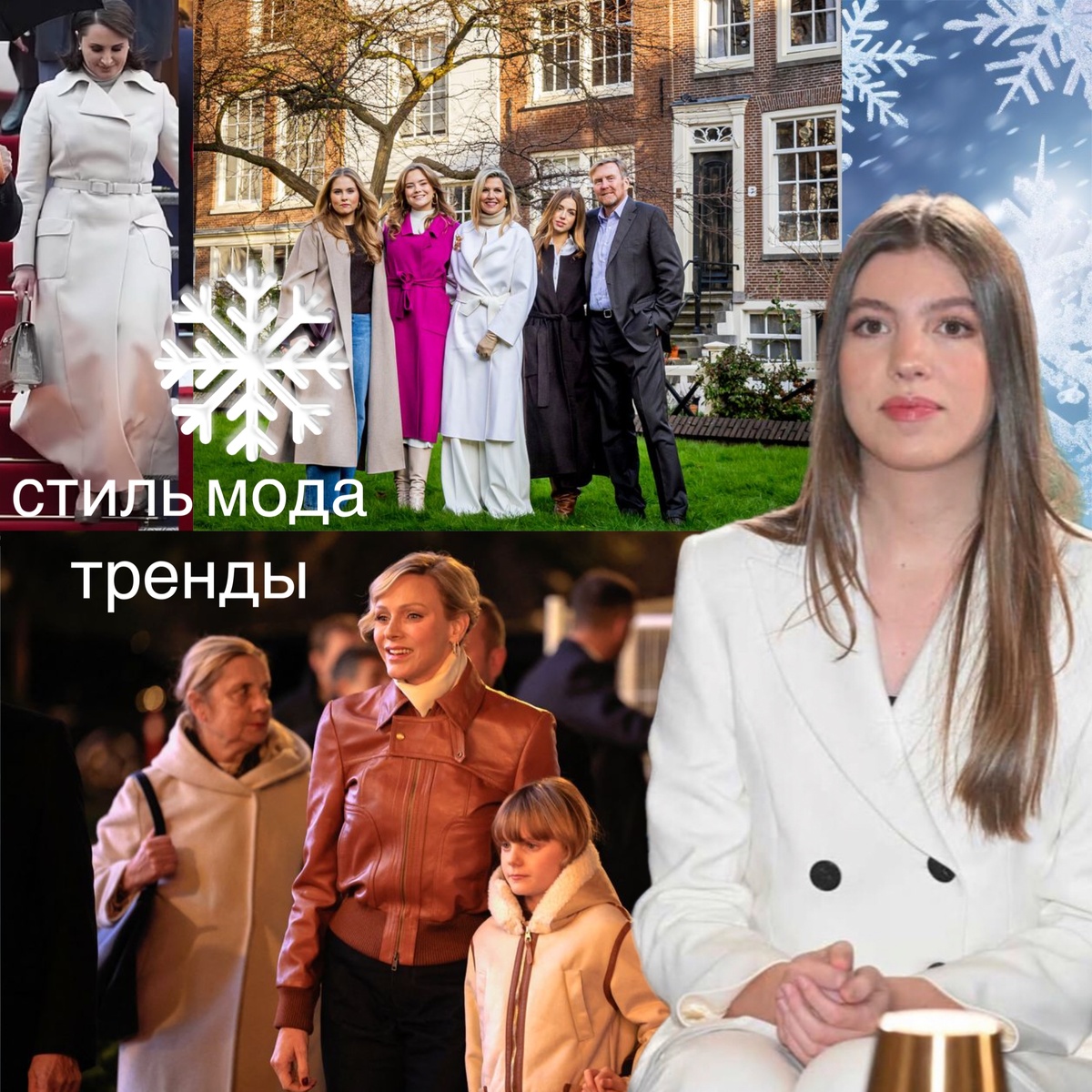 Хорошо, еще и первые леди. То, что бросилось в глаза и что мы с вами вскользь обсудили. Белый цвет- первый и очевидный тренд первого месяца зимы. Пусть календарной- не всем посчастливилось еще слепить снеговика. Белое пальто. Или, на крайний случай, белый костюм. Желательно брючный. Но можно и с юбкой, как на герцогине Эдинбургской. Желательно сверху еще белый жакетик. Видели на королеве Летиции. Накануне на инфанте Испании Софии. Ранее- на принцессе Астурийской Леонор. На королеве Максиме. И не раз! На шейхе Катара. На герцогине Глостерской. Камилла любит белое и носит его частенько в этом году. Брижит Макрон всегда предпочитала ахроматику. Но в этом декабре она активно выбирает на важные события именно белый. Мама принцессы Уэльской тоже выбирает в этом декабре белое пальто. Брючный бархатный костюм- еще один очевидный тренд! Желательно чистого коричневого или бордового цвета. Темного, классического, как на испанской королеве. Или темно-красный бархат , как на бель