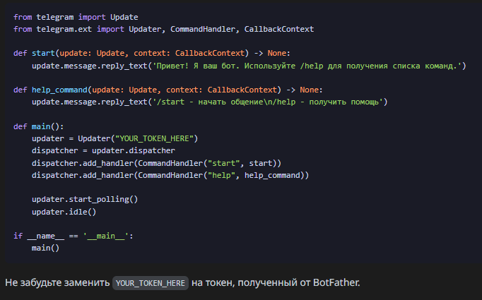 Telegram-боты становятся все более популярными, и их использование охватывает различные области — от автоматизации бизнес-процессов до развлечений. В этой статье мы рассмотрим одну из самых популярных библиотек для разработки Telegram-ботов на Python — python-telegram-bot. Мы также создадим интерактивного бота с кнопками и меню, чтобы вы могли увидеть, как это работает на практике. Библиотека python-telegram-bot предоставляет удобный интерфейс для работы с Telegram Bot API. Она позволяет разработчикам легко создавать ботов, обрабатывать сообщения, команды и взаимодействовать с пользователями. Библиотека поддерживает асинхронное программирование и предлагает множество возможностей для расширения функционала бота. Для начала, вам нужно установить библиотеку. Если у вас еще не установлен Python, сделайте это сначала. После этого откройте терминал и выполните команду: pip install python-telegram-bot Теперь, когда библиотека установлена, давайте создадим простого Telegram-бота. Мы начнем с