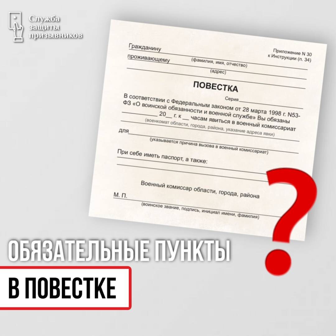 💁🏻♂️Фактически 2 недели отделяют вас до, надеемся, счастливого завершения осеннего призыва. Военкоматы работают, как молоты 🔨наковальни, но в этом есть и человеческий фактор, который может сыграть нам с вами на руку🧏🏻. Сотрудники стали допускать ошибки 😏— присылать повестки с опечатками или нехваткой данных. Поэтому берем в левую руку вашу повестку🫲, в правую — лупу 🔍и внимательно изучаем содержимое. ⠀ В повестке ОБЯЗАТЕЛЬНО должно быть: ▪️ФИО и дата рождения призывника ▪️адрес места жительства призывника ▪️дата, серия, номер повестки ▪️дата и время вызова в военкомат ▪️подпись военного комиссара ▪️печать военкомата ▪️строго одна причина вызова в военкомат: 👌для уточнения документов воинского учета 👌для прохождения медицинского освидетельствования или мероприятий, связанных с ним 👌для прохождения призывной комиссии 👌для отправки к месту прохождения военной службы ❌Если все эти причины собраны вместе - это незаконно! ⠀ 🙌🏻Если в вашей повестке нет какого-либо пункта, расс