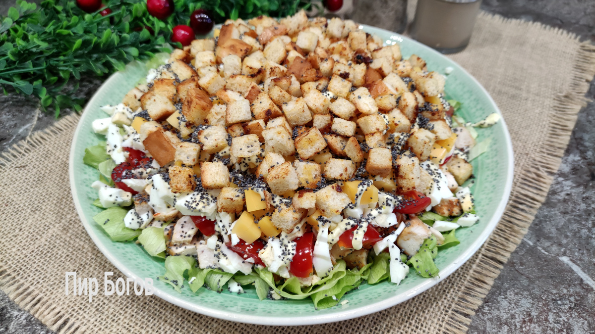 Мне часто встречался такой рецепт, и я его временами готовила, но почему-то не делилась с вами. Надо срочно это исправить, так как это очень вкусный, легкий и сытный салат. На праздничный стол и для семейного ужина идеальный. Состав: *** Видео рецепта можно посмотреть на других платформах: - Яндекс Дзене - RUTUBE - YOUTUBE Приглашаю всех в свой телеграм. Там публикуется больше разной информации и я всегда отвечу на ваши вопросы. Вот ссылочка https://t.me/PirBogov *** Способ приготовления: Куриное филе обмыть прохладной водой, обсушить бумажным полотенцем, нарезать крупными полосками и обсыпать специями. Я использую адыгейскую соль и аджику. После на горячей сковороде обжарить филе с двух сторон. Для жарки использую сливочное масло. Пока готовится курица занимаемся подготовкой других ингредиентов. На сухой сковороде обжариваем 1-2 минуты мак. Твердый сыр нарезаем на маленькие кубики. Несколько кусочков батона нарезаем на маленькие кубики. Когда куриное филе приготовится, то его необх