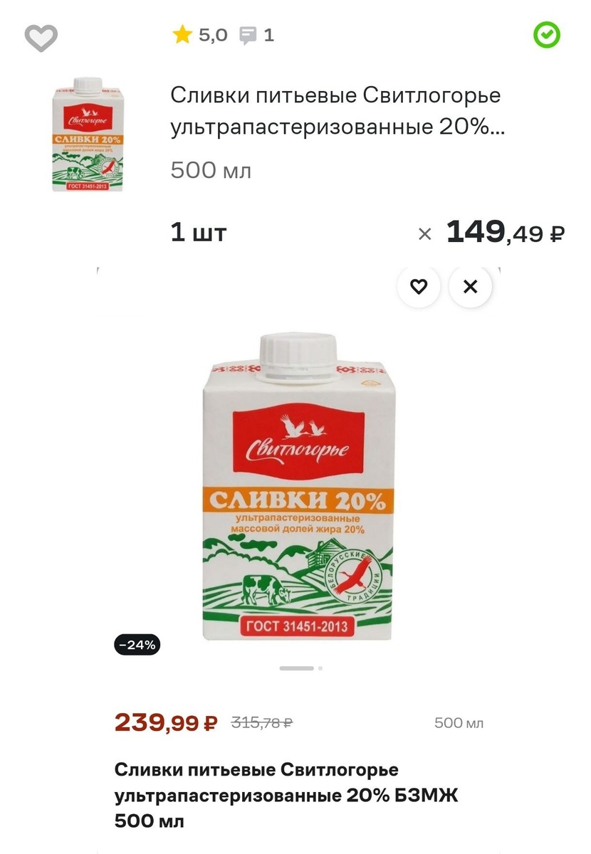 Так, 500 мл питьевых сливок можно было купить за 149,5 рублей. Сегодня цена без скидки — 315 рублей (239,99 со скидкой).