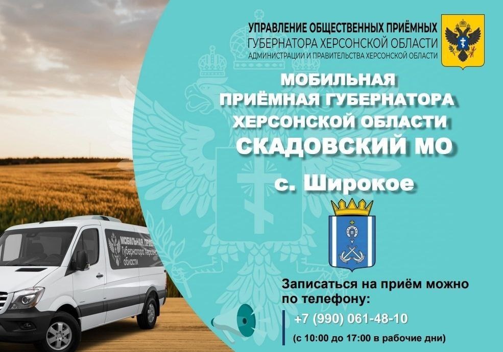 Мобильная приемная губернатора Херсонской области посетит 18 декабря село Широкое Скадовского муниципального округа. Об этом в своем Telegram-канале сообщил Владимир Сальдо. «Если вам нужна помощь или консультация представителей власти, обязательно приходите. Ваши обращения рассмотрят квалифицированные сотрудники федеральных и региональных органов управления, а также специалисты профильных ведомств», — написал глава региона. Записаться на прием в мобильную приемную можно по номеру телефона +7(990)-061-48-10 в будние дни с 10:00 до 17:00. Здесь жители смогут задать вопросы представителям различных органов власти по любым интересующим их вопросам. Ранее ТРК «Таврия» сообщала, что мобильная приемная губернатора Херсонской области Владимира Сальдо посетила Новотроицкий округ. В ходе приема жители округа озвучили более 70 вопросов, которые приняли представители органов исполнительной власти области и федеральных структур. ]]>