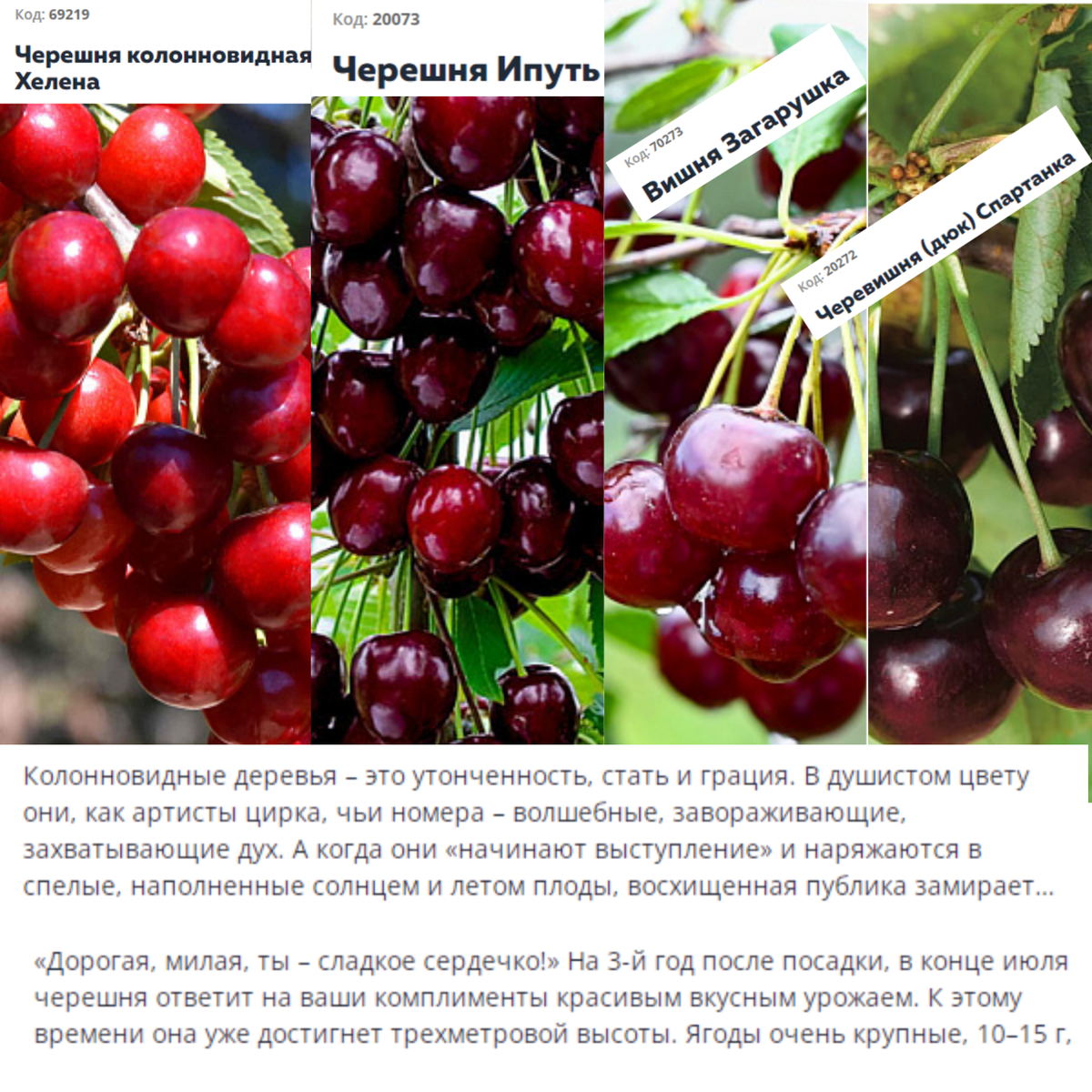 Сегодня хочу поговорить о черешне , о вишни и дюк . Выбор на Садах России колоновидных не так велик как хотелось бы мне . По этому будем брать то что есть . Сегодня у меня четыре сорта . Они уже заказаны и оплачены в весеннюю посылку . А значит придут точно . В Садах России в приоритете оплаченные заказы . бесплатная доставка от 15000 руб . В Садах России не такой большой выбор колоновидных саженцев черешни . А саду нужно разнообразие . И что бы не писали в интернет магазинах САЖЕНЦЕВ , о зимостойкости и тд и тп . Но предпочитаю перестраховаться . в Этом наборе одна колоновидная черешня ХЕЛЕНА : Теперь нужно решить какую опору использовать . Что бы сформировать черешню и вишню и дюк . Так как мне нужна определенная высота и определенная форма . Как правело черешни и вишни это куст . А кусты гибкие и это + , еще меня смущает в теплицах метал , если его так можно назвать . Буду думать . Не бывает ни чего вечного , и теплица это скучно . Мне бы хотелось иметь сад , частично закрытый сад