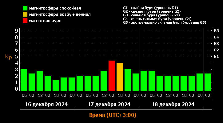 Завтра днем на Землю обрушится магнитная буря. Об этом информирует сайт Лаборатории солнечной астрономии ИКИ и ИСЗФ. Согласно прогнозам, магнитное поле Земли достигнет высоких значений завтра в 12:00. Геомагнитный индекс достигнет уровня 4,5 единицы. С 15:00 до 18:00 показатель снизится до 3 единиц. При этом индекс геомагнитной активности не превысит первый уровень G1, соответствующий слабой буре.