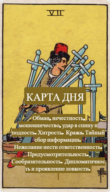 Обман, нечестность, мошеннические действия, удар в спину и подлость. Предусмотрительность. Сообразительность. Хитрость. Афера. Клевета. Ложь и коварство. Разбой, воровство, кража. Тайный сбор информации. Невезение. Нежелание нести ответственность. Попытки обойти неприятный вопрос. Дипломатичность и проявление ловкости. Достижения поставленных целей. Умение двигаться к результату любыми средствами. Нарушение этических правил, моральных принципов и устоев.