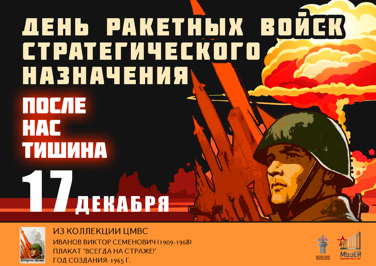 Ежегодно 17 декабря в нашей стране отмечается День Ракетных войск стратегического назначения. Центральный музей Вооруженных Сил Российской Федерации сердечно поздравляет всех, кто служил или служит в РВСН, а также всех принимавших участие в разработке оружия сдерживания. Желаем вам ясного видения любых ситуаций, взвешенных и продуктивных решений, бодрого командного духа. Здоровья вам, удачи, а также профессиональных и личных свершений!