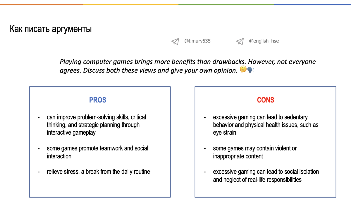 Продолжаем гриндить 💪 практику написания Эссе на английском! 🎮🕹📚 Тема сегодня: On the one hand Many argue that playing computer games can offer a range of cognitive and social benefits. For instance, interactive gameplay often improves problem-solving skills, critical thinking, and strategic planning, as players navigate complex challenges and scenarios. Moreover, many multiplayer games promote teamwork and social interaction, helping players develop communication and cooperation skills. Finally, gaming can serve as a way to relieve stress and take a break from the daily routine, providing much-needed relaxation and entertainment. On the other hand However, critics believe that the disadvantages of excessive gaming outweigh the benefits. Spending too much time playing can result in sedentary behavior, leading to physical health issues such as eye strain and poor posture. Additionally, certain games contain violent or inappropriate content, which may negatively influence younger pl