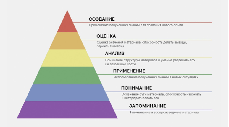 Когда мы учимся, нужно предлагать реальные действия, потому что в жизни мы активно используем знания. Нам не нужны знания ради знаний — они важны для решения проблем. А для этого нужно уметь анализировать, оценивать и создавать.