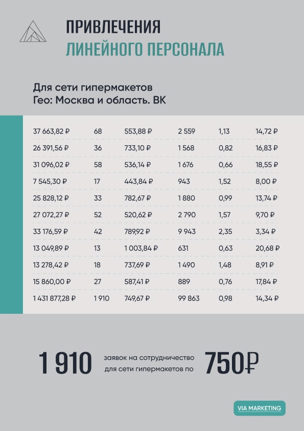 Подбор персонала через таргет это: возможность выйти на нужную целевую аудиторию(по гео и ключевым словам), возможность получать стабильный поток заявок по прогнозируемой цене, возможность оперативно вносить корректировки (в случае изменения условий для потенциальных сотрудников), возможность усиливать рекламные кампании на те вакансии, набор на которые в данный момент времени наиболее актуален. К сожалению, по условиям договора, мы не можем написать здесь название бренда. Но мы можем опубликовать и показать результаты, которых достигли. Мы получили 1910 заявок по 750 рублей. Для построения эффективной рекламной кампании мы проводили глубокие маркетинговые исследования. Слияние миссии, взглядов и ценностей вашей компании и наш опыт служат гарантией для лучшего результата. Мы постоянно улучшали результаты и стремились к максимально высокой конверсии и низкой цене заявки. И это у нас получилось. стоимость лида для Москвы и области получилась отличная, а заявки качественные. Протестировал
