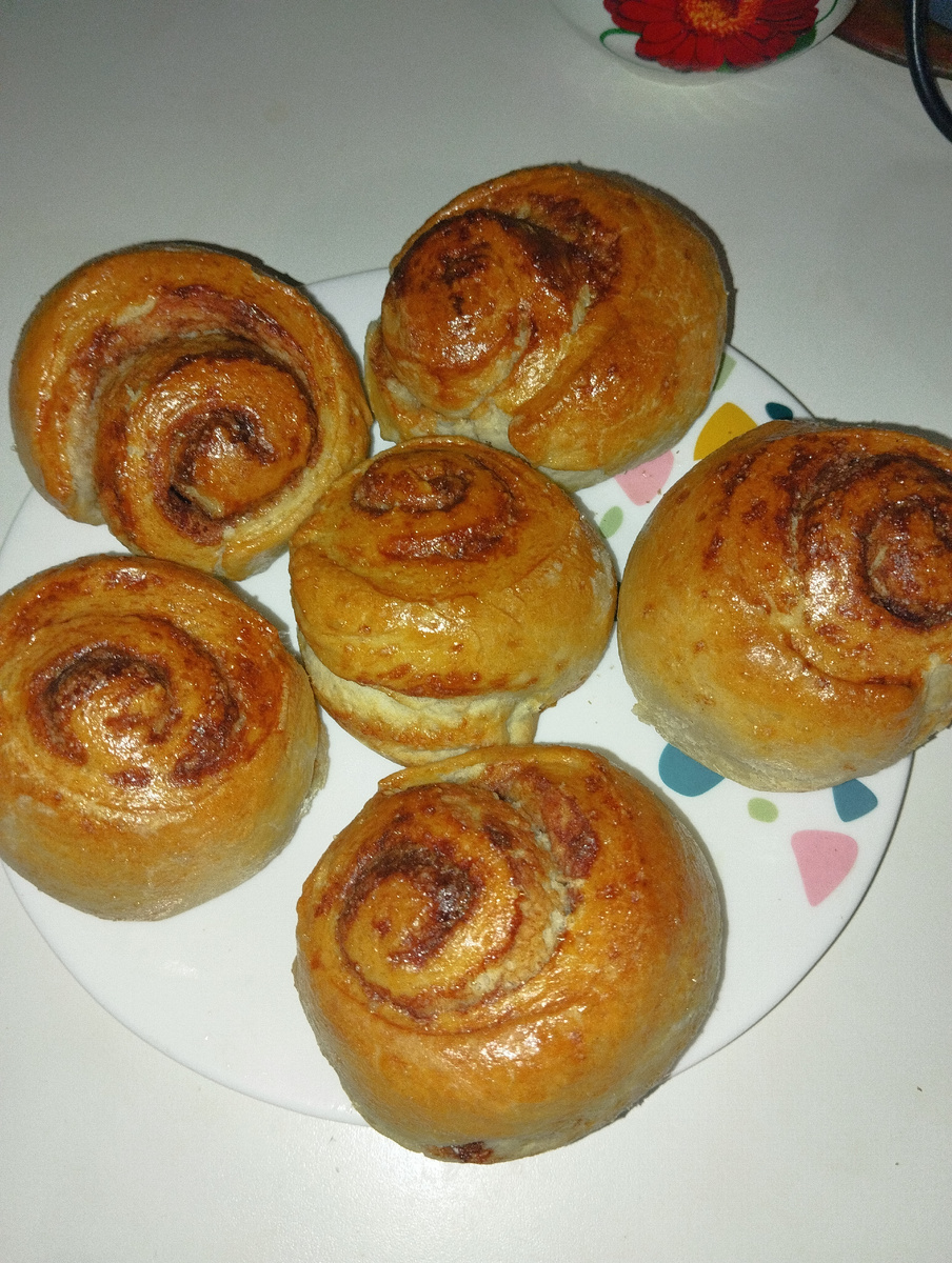 Люблю я заниматься выпечкой. Да и домашние привыкли к разным вкусностям по выходным. Сегодня поделюсь рецептом нежнейших, румяных булочек с корицей. Аромат такой, что не устоять. Подготовим дрожжевое тесто. Для этого возьмём стакан молока. Смешаем с 1/3 стакана растительного масла. Добавим дрожжи сухие и одно яицо Щепотку соли и две столовых ложки сахара. Теперь постепенно вводим просеянную муку и вымешиваем тесто. Вымешиваем хорошо, времени не жалеем для этого. Тесто получается очень пластичным и не липнет к рукам. Прежде чем вымешивать, смажьте руки растительным маслом. Отлично! Тесто готово. Накрываем пищевой плёнкой или чистым полотенцем. И оставляем на пару часов подниматься. Для того чтоб тесто поднялось быстрее, я под него ставлю кастрюлю с горячей водой. Примерно градусов 60. Так тесто не заставит себя ждать. Маленькие хитрости экономии времени!) И так, когда тесто поднимется, раскатываем или растягиваем кусочек теста на столе, немного присыпав его мукой. Посыпаем саха