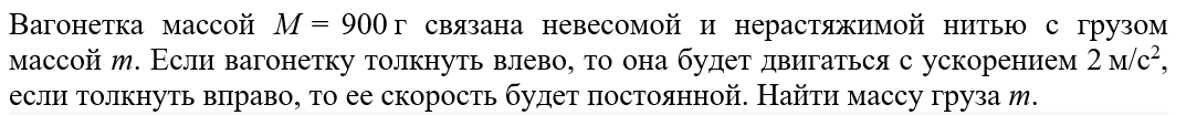 Полное условие задачи: Краткое условие задачи: Решение задачи: Рассмотрим задачу в системе отсчета, связанной с Землей. Будем считать эту систему отсчета инерциальной (ИСО). Грузик и вагонетка движутся поступательно, поэтому описываем их моделью материальной точки. В ИСО движение материальной точки описываем вторым законом Ньютона. Нить невесома, блок идеален (масса блока ничтожна, трения нет), поэтому модуль силы натяжения нити в любой ее точке одинаковый. Нить нерастяжима, при прямолинейном поступательном движении модули ускорений грузика и вагонетки будут одинаковыми. Движение вагонетки поступательное по шероховатой поверхности, поэтому на нее действует сила трения скольжения. В горизонтальном направлении на вагонетку действуют сила трения и сила натяжения нити. В первом случае они обе направлены против движения, вагонетка движется равнозамедленно. Во втором случае силы направлены в разные стороны и компенсируют друг друга, поэтому вагонетка движется равномерно. Запишем для них втор