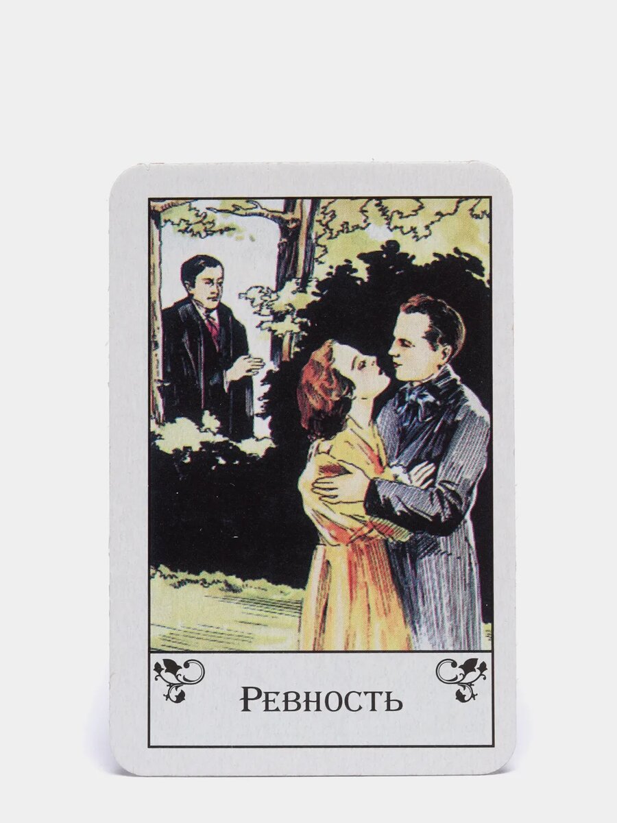Карта Ревность это сто восьмая карта колоды, которая обозначает ревность, измену, отсутствие доверия и любви. Карта Ревность предупреждает о возможных сложностях, которые могут возникнуть в связи с этим чувством. В отношениях она может указывать на отсутствие доверия и любви, а в других случаях — на зависть. Возможно, стоит обратить внимание на поведение окружающих людей и проанализировать его. Карта Ревность может говорить о зависти, измене, недоброжелательности, желании строить козни и фальшивой дружбе. В целом, речь идёт о лжи, которую трудно распознать. Иногда другие карты в раскладе могут помочь определить направление, в котором стоит искать, но это не всегда так. Если вы сами испытываете подобные чувства, постарайтесь избавиться от них, так как они могут нанести только вред. Человек, который ревнует и завидует, пытается скрыть свои эмоции. Он не обязательно настроен враждебно, но и не будет испытывать радость от ваших достижений. В бизнесе иногда возникают проблемы, связанные с