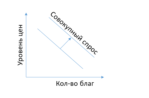 Все мы знаем, пожалуй, что кривая спроса на отдельный товар имеет вид нисходящей кривой. Чем больше цены, тем меньше товара купят. Однако по аналогии можно построить график совокупного спроса в рамках всей экономики, на все произведённые товары. Если цены в среднем вдруг станут выше, то у потребителей окажется меньше денег и они предъявят спрос на меньшее количество товара (есть и ещё объяснения этому, но мы их тут пропустим). Если потребителям выдать больше денег, то очевидным образом кривая спроса смещается вверх.