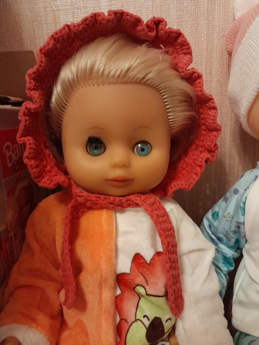 Зовут красавицу Алёнка. Ресницы на одном глазике выдернуты мною лично совсем в маленьком несмышленом возрасте, но и сейчас помню сей эпизод и ужас от осознания, что испортила любимую куклу🙈 купила ресницы на wb, пока размышляю, чинить или оставить как есть)