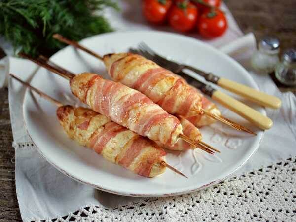 Мокрыми руками разделите фарш на порции, дальше его нужно нанизать на деревянные шпажки в виде кебабов, полоской бекона оберните кебаб по всей длине. Можно куриное "эскимо" завернуть в бекон полностью, а можно слегка, в этом случае одной полоски бекона будет достаточно.