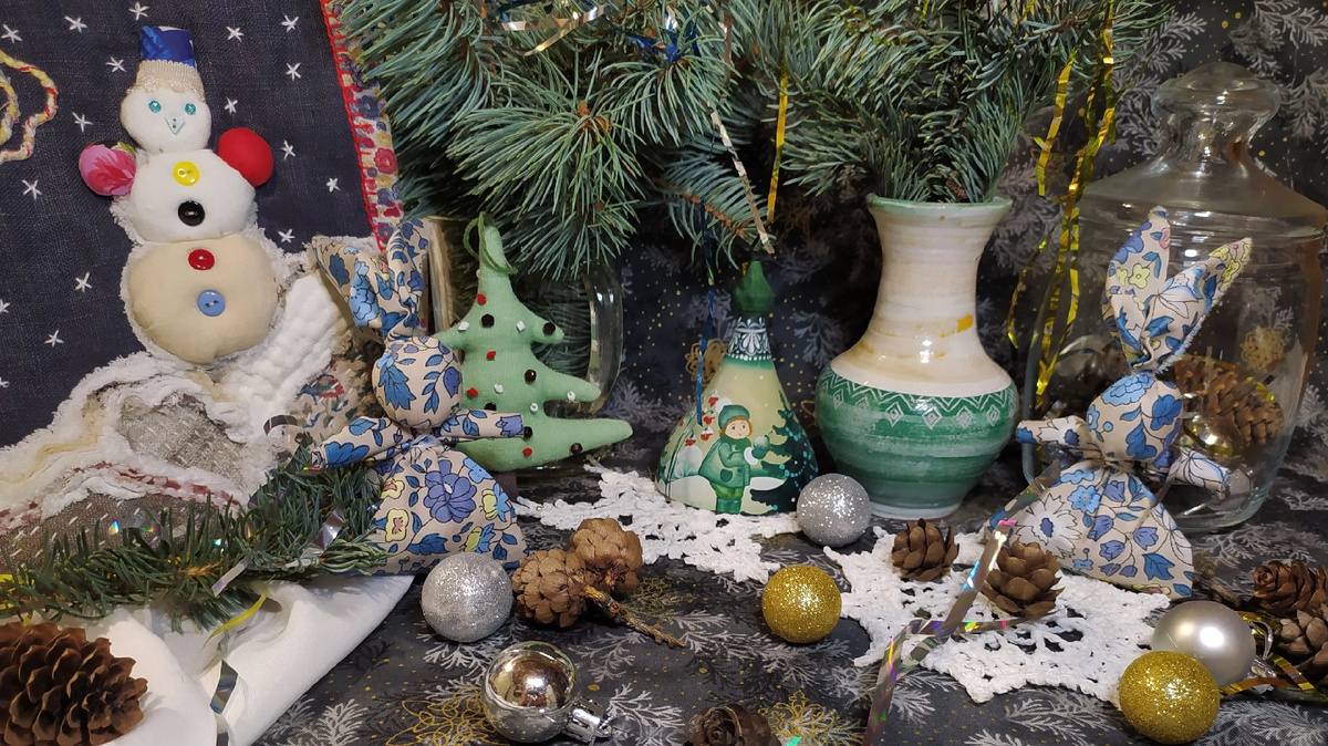 Фото выше - один из моих новогодних букетов. Веточки голубой ели, украшенные белыми льняные ангелами и снежинками.