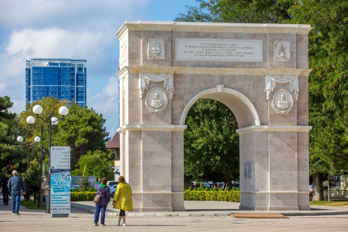 На Театральной площади неподалёку от Центра культуры «Родина» расположена одна из самых «молодых» достопримечательностей Анапы – Триумфальная арка.