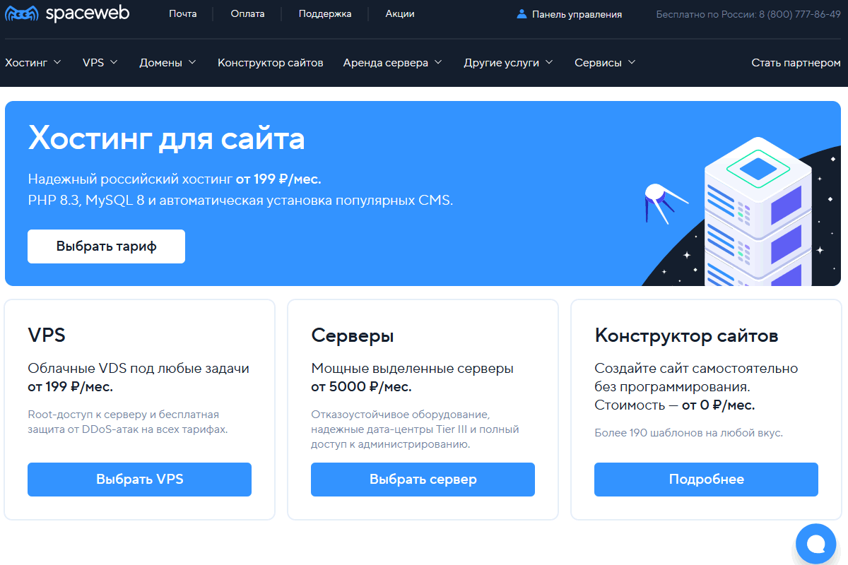 Выбор хостинга для сайта для многих становится непростой задачей. Очень важно, чтобы сервис был надёжным, управление удобным, а цены невысокими. Всем этим требованиям отвечает Spaceweb. Spaceweb работает уже 23 года, дата-центры класса Tier III размещены в Москве и Санкт-Петербурге, что обеспечивает оптимальную надёжность и балансировку нагрузки. Тарифы на виртуальный хостинг начинаются от 199 рублей в месяц при оплате за год. Для хранения сайтов используются скоростные NVMe-диски. Автоматически делаются ежедневные бэкапы. Есть антиспам, антивирус для почты и бесплатная защита от DDoS-атак. У Spaceweb действует акция: 4 месяца хостинга в подарок при переносе сайта с другого хостинга + бесплатный перенос сайта с помощью технических специалистов Spaceweb. Есть конструктор сайтов, позволяющий создать свой сайт без дизайнеров и программистов. Всего предлагается более 190 шаблонов, 44 из них бесплатны при регистрации или переносе домена. А ещё Spaceweb предлагает быстрые VPS и VDS серверы,