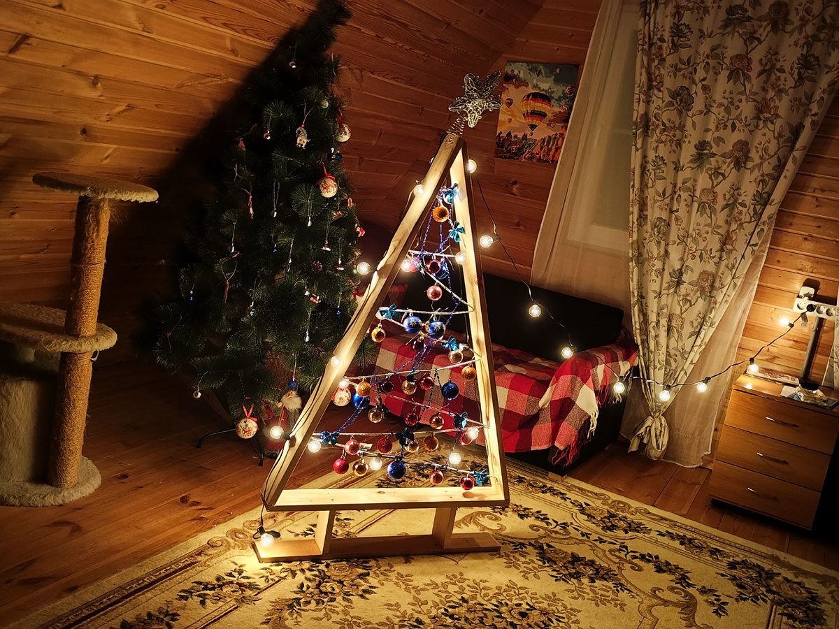 Всем привет! Ну что за новый год без ёлки. Так мы с женой начали гонку кто первый соберёт ёлку, только был один нюанс - мне нужно было её изготовить. А для этого мне понадобилось буквально 4.5 метра доски с сечением 25*100мм. И да, я проиграл очень быстро, пока собирал верстак и таскал инструмент с материалом, искусственная ёлочка была уже собрана. Арт - ёлка в изготовлении проста до бональности. Состоит она из 6 элементов. В моём варианте пришлось строгать доску, но можно купить сухую строганную. Доски напилил: 125см - 2шт , 85см - 2шт , 15см - 2шт. Все размеры взял по факту, когда две доски поставил ёлочкой. Углы не мерил а просто внахлёст прислонил доску, отметил и отпилил под этим углом. Крепил на саморезы, предварительно сделал углубления под шляпки саморезов. С украшениями всё очень просто. Зашёл в магазинчик, где продаётся вся бытовая мелочёвка. Купил по дешёвке: верёвку, новогодние шарики, бусы, бантики и звезду. Осталось только закрепить верёвку с помощью степлера и повесит