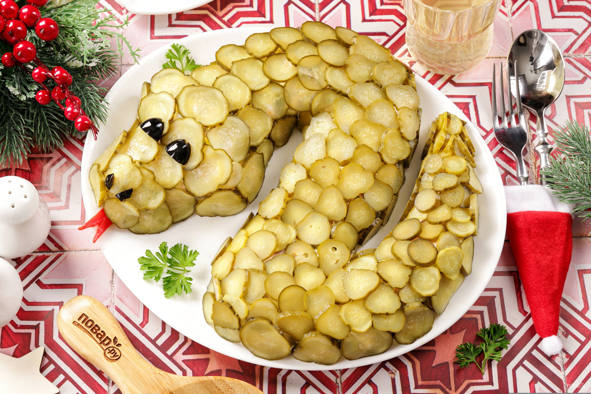 9. Маринованные огурцы нарежьте тонкими кружочками. Обкладываем всю змею нарезанными огурцами, имитируя кожу змеи.