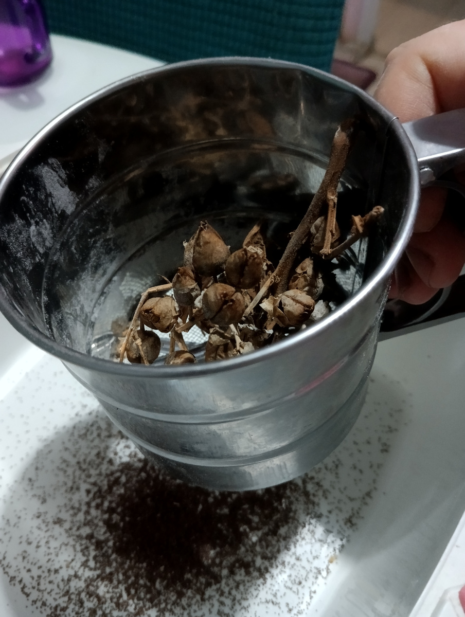 В прошлом году собрали очень много семян с "Вирджинии", " Берлея" и "Дуката", поэтому этой осенью оставили цветоносы на других сортах. Наконец-то дошли руки пересеять и отправить на хранение. Используем такую кружку-сито для муки: На выходе - довольно чистые семена: Итоги: 9 граммов Туркиш Голда и 13 граммов Герцеговины Флор. Немного позднее проверим всхожесть