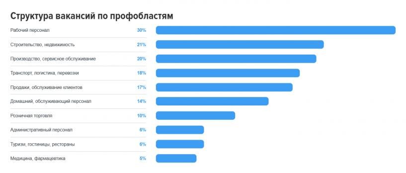 По итогам ноября в Омской области открыты 17 тысяч вакансий. Лидерами по количеству предложений остаются сферы «Рабочий персонал» (30 % всех вакансий), «Строительство, недвижимость» (21 %), «Производство и сервисное обслуживание» (20 %), а также «Транспорт, логистика, перевозки» (18 %). Стабильный спрос наблюдается и в «Продажах, обслуживании клиентов» (17 %), «Домашнем и обслуживающем персонале» (14 %), «Розничной торговле» (10 %), «Административном персонале» и «Туризме, гостиницах, ресторанах» (по 6 %). На сферу «Медицина и фармацевтика» приходится 5 % вакансий. В сравнении с ноябрём прошлого года спрос на специалистов по страхованию вырос на 56 %. Вакансий для административного персонала стало больше на 38 %, а для кадров из сфер стратегии, инвестиций и консалтинга — на 31 %. Повышенный интерес работодателей наблюдается к домашнему персоналу и специалистам по логистике (по +20 %), а также к сотрудникам науки и образования (+19 %). Снижение количества вакансий отмечено в сфере HR и