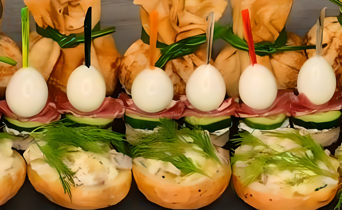 Ложкой наносим подготовленный творожный сыр на обжаренный хлеб , сверху выкладываем огурец, сырокопченую колбасу, перепелиное яйцо и сверху прокладываем шпажкой.