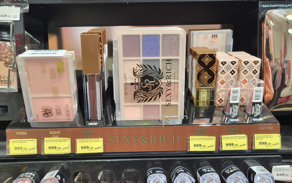 Такого точно никто не ожидал! Наш старый добрый Stellary внезапно выпустил еще одну коллекцию косметики, которая уже появилась в некоторых МК и частично на маркетплейсах. А ведь совсем недавно, всего лишь два месяца назад мы обсуждали новинки Imperial Jewels. Новая коллекция называется Se$$y & Rich Collection. Ну, примерно так она называется. Мне пришлось внести незначительные коррективы в название, так как первое слово во всех его вариациях табуировано на площадке, и его использование в тексте скорее всего станет причиной ограничений. Надеюсь на ваше понимание. Полное название смотрите на фотографиях. Коллекция небольшая, в ней всего лишь шесть косметических продуктов: Цена в МК на все продукты одна). Любое средство можно купить там "всего лишь" за 999 рублей. Думала, что это какая- то ошибка и цены не "встали", как это иногда бывает с новыми коллекциями нашей большой четверки (правда, обычно они не встают в меньшую сторону, как заметили в обсуждении к посту в tg). Проверила через не