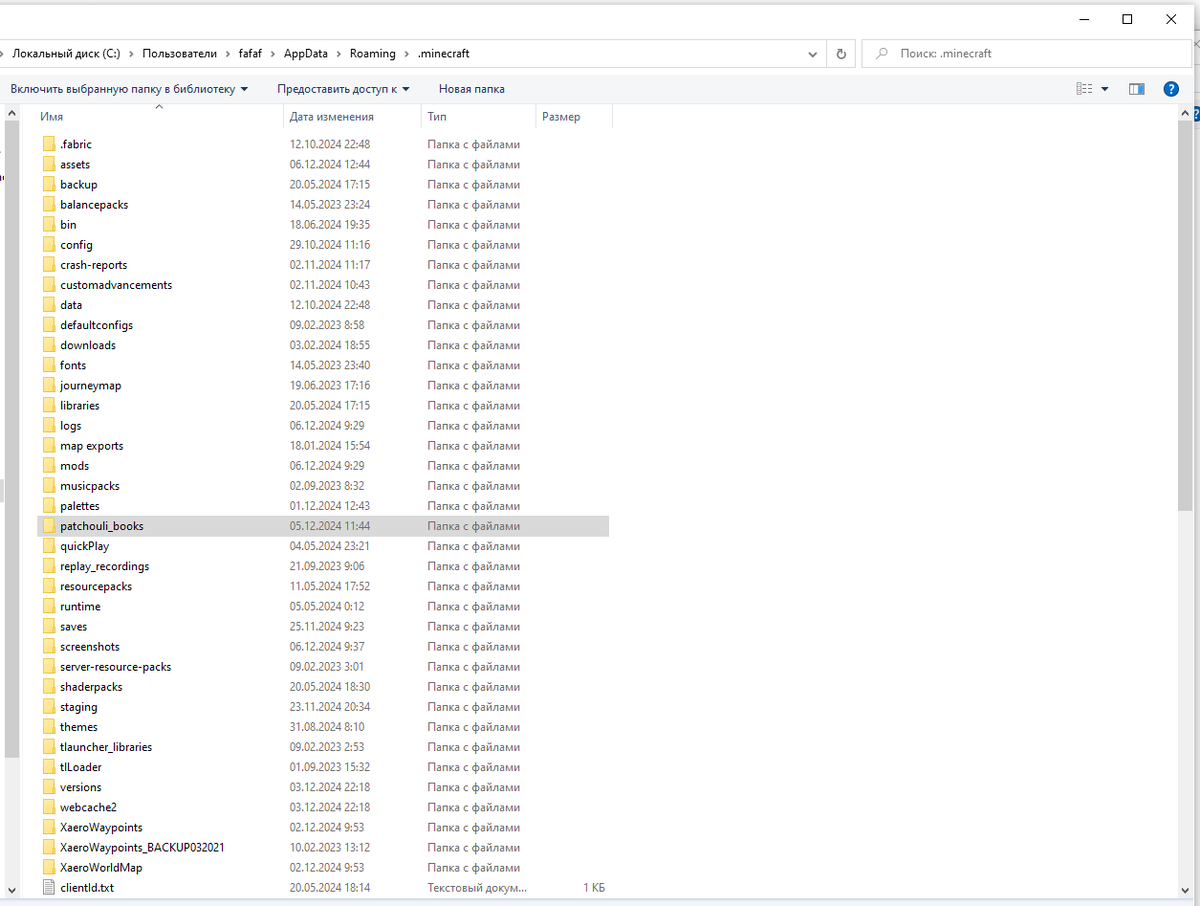 После первого запуска игры с модом Patchouli появляется вот такая папка: