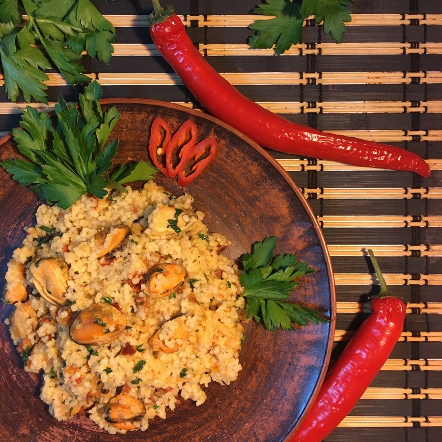 Готовим кус-кус с мидиями, который позволит почувствовать необычайную атмосферу побережья Туниса. На две порции нам понадобятся: 100 г кус-куса, 120 мл бульона или воды, 100 г мяса мидий, а также 1/2 цукини, 1/2 болгарского перца, 1/2 моркови, 1/2 луковицы, 2 ст. л. оливкового масла, петрушка, соль и перец. Мидии нужно разморозить и промыть, а овощи (лук, морковь, перец) очистить и нарезать кубиками. Затем на сковороде с разогретым оливковым маслом обжариваем морковь и лук до золотистого цвета, добавляем перец и цукини, затем - мидии. Обжариваем еще несколько минут. Всыпаем кус-кус, заливаем все горячим бульоном и накрываем крышкой, оставляя настояться на 7–10 минут. Готовое блюдо по вкусу украшаем зеленью.