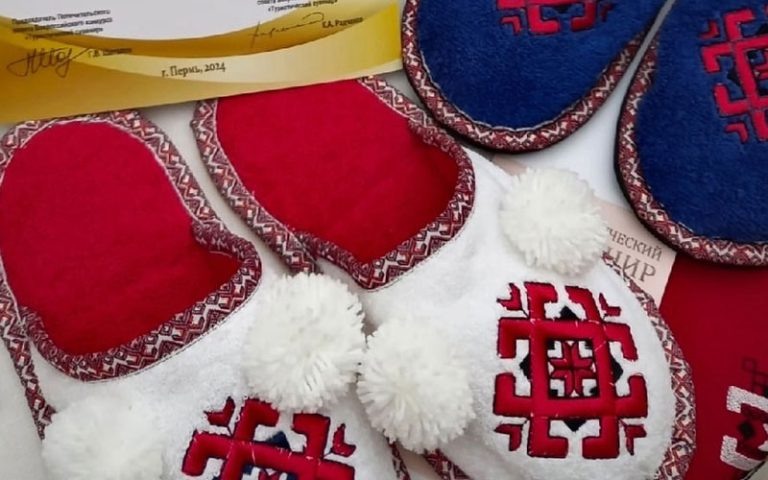 На завершившемся в Перми общенациональном финале X Всероссийского конкурса «Туристический сувенир» отличились «Мордовские» тапочки. Как сообщают организаторы, всего в этом году поступило 3365 заявок от авторов и производителей туристических сувениров из 70 регионов России, а также из Беларуси. В финале участвовали авторы, представившие свои работы в 787 конкурсных позициях. Среди финалистов юбилейного сувенирного конкурса в Перми Мордовию представляли Анна Манеева с комплектом авторских современных женских украшений в этническом стиле из бисера и Наталья Агеносова. Последняя номинировала два варианта домашней обуви, декорированные национальным орнаментом – мужские синего цвета и светлые женские с кокетливыми помпонами. Эксперты присудили тапочкам третье призовое место в номинации «Этнографический сувенир».