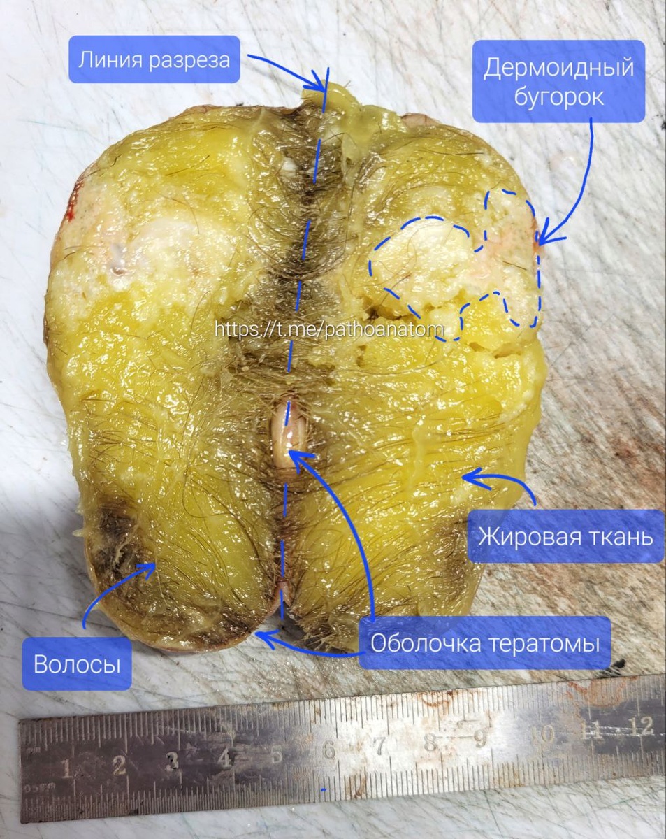 Сегодня хочу показать вам тератому из яичника, которая недавно попалась мне на вырезке. Герминогенные опухоли – новообразования из первичных половых клеток эмбриональных гонад и их производных, из трёх зародышевых листков – эктодермы, эндодермы и мезодермы. К доброкачественным герминогенным опухолям можно отнести и зрелую тератому. По строению она чаще всего представляет собой дермоидную кисту, заполненную чаще всего жировой тканью и волосами. На внутренней поверхности на стороне ткани яичника есть дермоидный бугорок, в котором локализуются все компоненты тератомы – в основном производные эктодермы: волосы, кожа, зубы; могут быть производные мезодермы: жир, костная, хрящевая ткань, мышечные волокна, а также структуры из нервной ткани. ⬆️ На фото обведен более плотный белый участок, в котором мы как раз и ожидаем увидеть все компоненты данной тератомы. 📈 В целом чаще всего тератомы растут медленнно и бессимптомно, обнаруживаются на УЗИ случайно. Однако, т.к. происходят они из половых