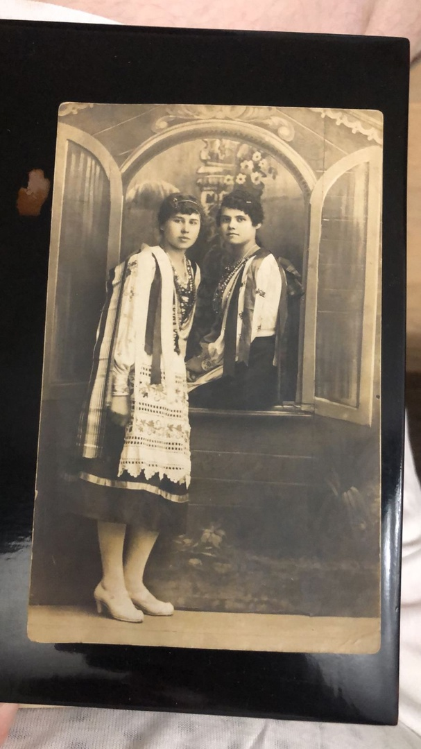 Cтулягина Лидия Фёдоровна слева (урожденная Рачинская) со своей сестрой Ольгой Федоровной (сидит) в карнавальных костюмах 1919 год, г. Бобруйсr