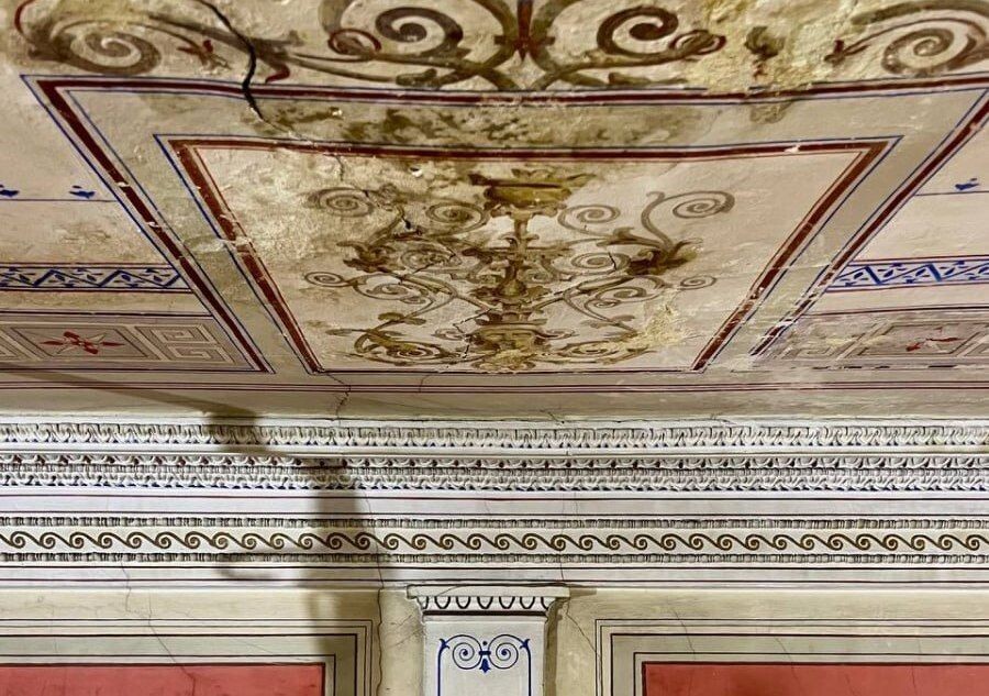 В Петербурге продолжается реставрация дома Брюллова на Кадетской линии, 21. Кадрами работ в Помпейском зале поделилось петербургское отделение Всероссийского общества охраны памятников истории и культуры. «Большую часть росписей плафона в зале удалось сохранить, но его центральная часть провисла на полметра, – сообщили сегодня в пресс-службе городского правительства. – Чтобы её поднять, мастера разобрали пол третьего этажа». Как отмечается, после реставрации в одном из помещений особняка Брюллова будет размещена экспозиция, посвящённая Музею Старого Петербурга, основанного Павлом Сюзором. Ранее «Петербургский дневник» сообщал, что в Эрмитаже представили уникальные экспонаты из античного стекла.