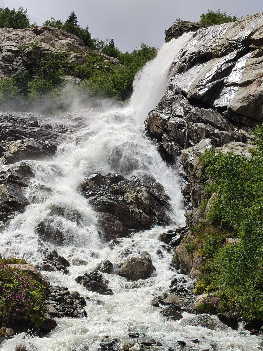 Алибекский водопад — это одна из самых красивых природных достопримечательностей Домбая. Водопад высотой около 25 метров образуется из таяния одноименного ледника. Мое впечатление Посещение Алибекского водопада оставляет незабываемые впечатления. Величественный поток воды, падающий с высоты, создает мощный шум и освежающий бриз. Окружающие горы и альпийские луга добавляют этому месту особую атмосферу спокойствия и величия. Мы шли пешком, и это позволило нам полностью насладиться красотой окружающей природы и сделать множество фотографий. Дорога к водопаду Маршрут к водопаду начинается в поселке Домбай. Сначала нужно пройти по центральной улице до конца, где асфальтированная дорога сменяется грунтовкой. Дорога ведет через живописное ущелье Алибек. Можно пройти пешком или воспользоваться внедорожником, что значительно сократит время в пути. Пеший маршрут занимает около 2,5 часов в одну сторону. На машине можно проехать до пограничного поста, что облегчит дорогу, особенно если вы пут