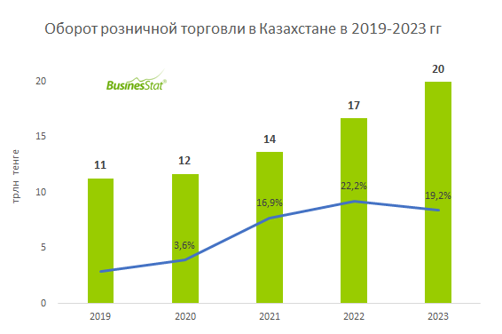 В 2019-2023 гг оборот розничной торговли в Казахстане вырос на 76,2%: с 11,3 до 20,0 трлн тенге.