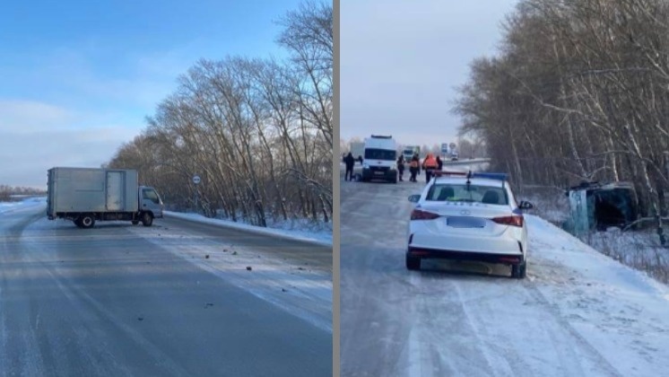 Под Новосибирском рейсовый автобус до Чистоозёрного улетел в кювет и упал на бок