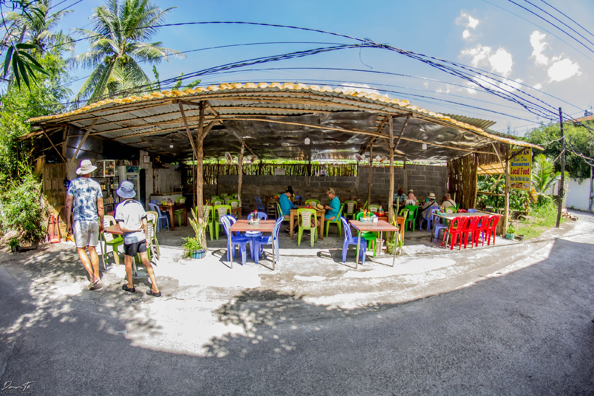 Заведение его, это навес под которым располагаются столики. За тонкой стенкой размещается кухня, где-то дальше кухни живёт он и вся его семья.