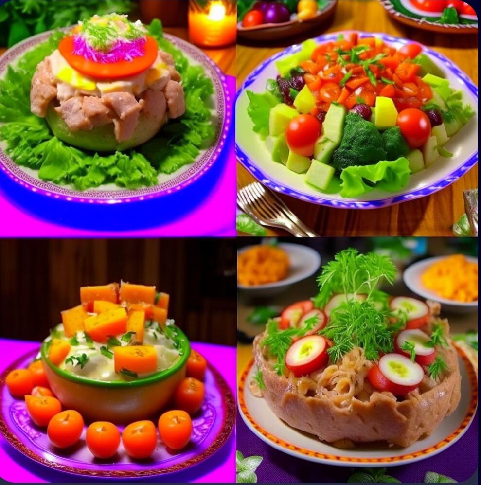 Оливье с языком Классический салат с отварным языком, картофелем, морковью, зелёным горошком и майонезом. Сельдь под шубой Слоёный салат из сельди, свёклы, картофеля, моркови, лука и майонеза. Цезарь с курицей Листья салата ромэн, куриное филе, пармезан, гренки и соус цезарь. Гранатовый браслет Яркий слоёный салат с курицей, гранатом, свёклой, морковью и грецкими орехами. Мимоза Нежный салат с консервированной рыбой, яйцами, сыром, луком и майонезом.