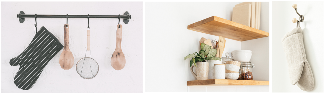 - Крючки под шкафами. Это идеальное место для кружек, кухонных ножниц или даже небольших кастрюль. Вы удивитесь, как много вещей можно разместить под шкафами. Кроме того, это отличная альтернатива рейлингам, если хотите сохранить минимализм на кухне или предпочитаете скрытую систему хранения.