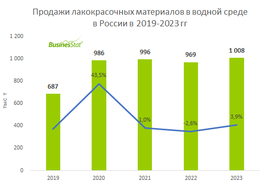 Продажи лакокрасочных материалов в водной среде в России в 2023 г выросли на 3,9%: с 969 до 1 008 тыс т.