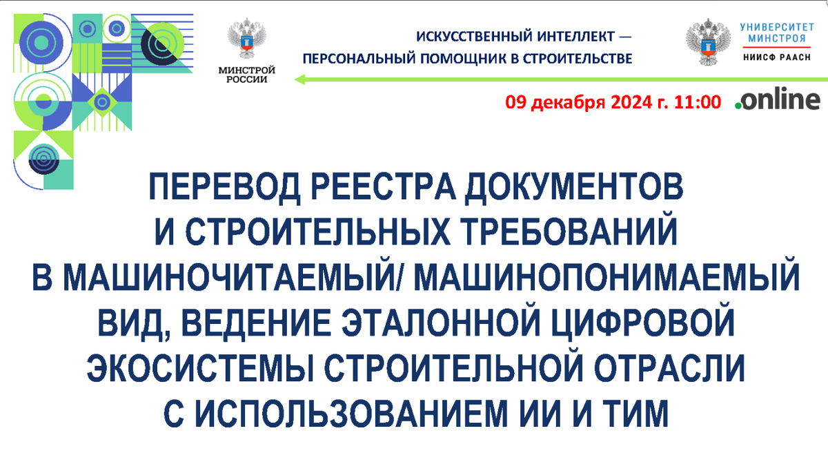Вебинар. Перевод реестра документов и строительных требований в машиночитаемый/ машинопонимаемый вид, ведение эталонной цифровой экосистемы строительной отрасли с использованием ИИ и ТИМ Вебинар проводится в рамках курса "Искусственный интеллект - персональный помощник в строительстве" ВИДЕО