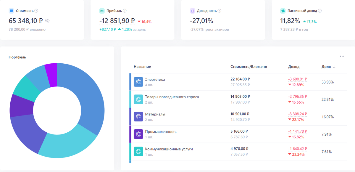 На моей улице небольшой праздник. Намного раньше ожидаемого пришли дивиденды от Инарктики. Значит у меня к еженедельному пополнению в 1250 рублей добавилось 174 рубля. Вот такое небольшой подарок от Инарктики. В данный момент я не сильно нуждался в этих деньгах, но пусть лучше у меня полежат на счете. Пригодятся при покупке дорогих акций. Каких-то особых хороших или плохих новостей нет, кроме описанных выше дивидендов. Значит сразу перейду к покупкам. Как и планировал, купил 1 лот ( 10 акций ) Совкомфлота по цене 85,42р. Всего у меня уже стало 60 акций со средней ценой покупки 113,5р. Очень хорошо упали акции. Надеюсь не зря продолжаю покупать и порадуют дивидендами. Если не в январе, то летом получу хорошие выплаты сразу за год. Северсталь утвердила дивиденды - ждем отсечки и выплату. На данный момент мой портфель выглядит так: Минус не растет, доходность вроде не падает. Будем считать, что я на дне и дальше только вверх. Прогноз по дивидендам выглядит так: