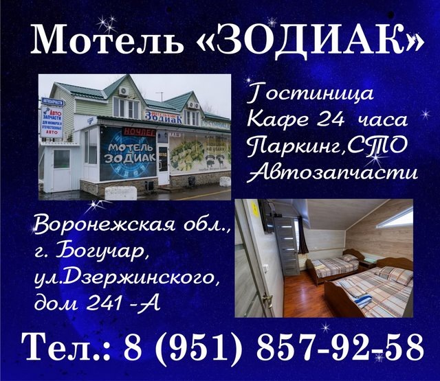 В комфортабельном мотеле "Зодиак" уютные двухместные и семейные номера, со всеми удобствами. Бесплатный Wi-Fi.
