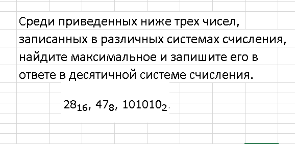 Да, когда то его решали примерно 5% всех сдающих. Сейчас сдающих информатику ОГЭ ещё больше, но теперь 10-е задание решает даже стабильный двоечник. "Решает" - громко сказано. Решает разумеется программа, а какая? Разумеется речь об электронной таблице, но не абы какой-то. Тут нужно пользоваться именно Экселем. Почему? Патамушта! Потому что даже формула в нём на русском языке и понятны всем, кто умеет писать и читать по-русски! Не нужно ничего решать на бумаге, правила перевода из одной системы счисления в другую. Всё это неважно. Важно решить задание. Поэтому пишем эти числа в столбик сначала, а потом в соседней ячейке набираем = шес сразу выйдет подсказка на перевод числа из 16-ричной системы в какую?, нам нужно в десятиричную, поэтому выбираем ШЕСТН. В ДЕС. И указываем мышкой на переводимое число, у нас это 28 Получили 40. То же самое делаем с восьмиричным числом вбивая =ВОСЬМ. В ДЕС. Получаем 39 И наконец =ДВ. В ДЕС. Получаем 42 Итак ответы на все числа в разных системах получены в