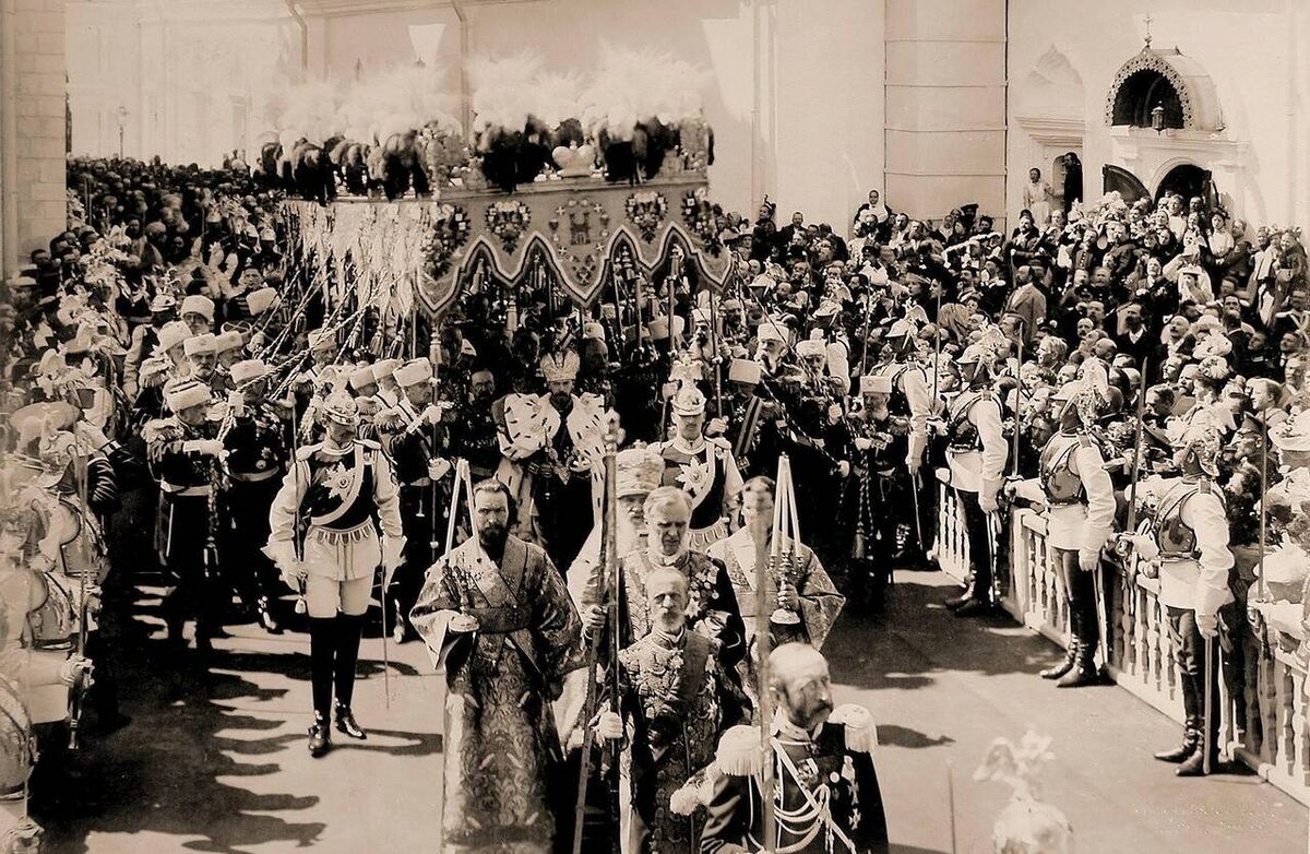 Во вратах Успенского собора стояли три митрополита: Палладий, Иоанникий, Сергий. Она подошла под благословение ко всем трём и всем поцеловала руку, тогда они расступились, и она вошла в собор. Перед Царскими дверьми стояло множество архимандритов в митрах и духовенства. Все ей поклонились, тогда она обратилась к Царским вратам и медленно поклонилась, осенив себя крестом. Обернувшись к стоявшим вдоль всего собора на эстрадах, она двинулась к своему месту и села на престол. Мы оправили на ней порфиру. Увидев стоявшего герольда Прибыльского, её передёрнуло. Она наклонилась ко мне и шепнула: «Le meme homme qu’alors» [Тот же мужчина, что и тогда], – и смолкла. Ей, видимо, было очень тяжко. Долгое ожидание увеличивало томление. Мало-помалу входили новые лица, сановники и занимали свои места. Перед местом императрицы – решётка, за которой внизу стояли великие княгини. Ближе всех стояла великая княгиня Мария Павловна, которая поглядывала то и дело на императрицу сквозь решётку. Я видел, что императрица заметила эти недоброжелательные взгляды. Она сидела бледная и величавая. Около неё ассистенты – наследный принц Датский и великий князь Алексей Александрович. Я стоял у правого плеча, опираясь на престол…
