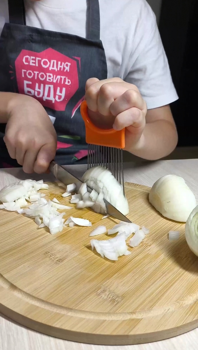 Нарезаем лук: мелко, но с любовью. Высыпаем его на раскалённую сухую сковороду. Здесь главное не отвлекаться, чтобы лук не превратился в угольки — нам нужен аппетитный золотистый цвет.