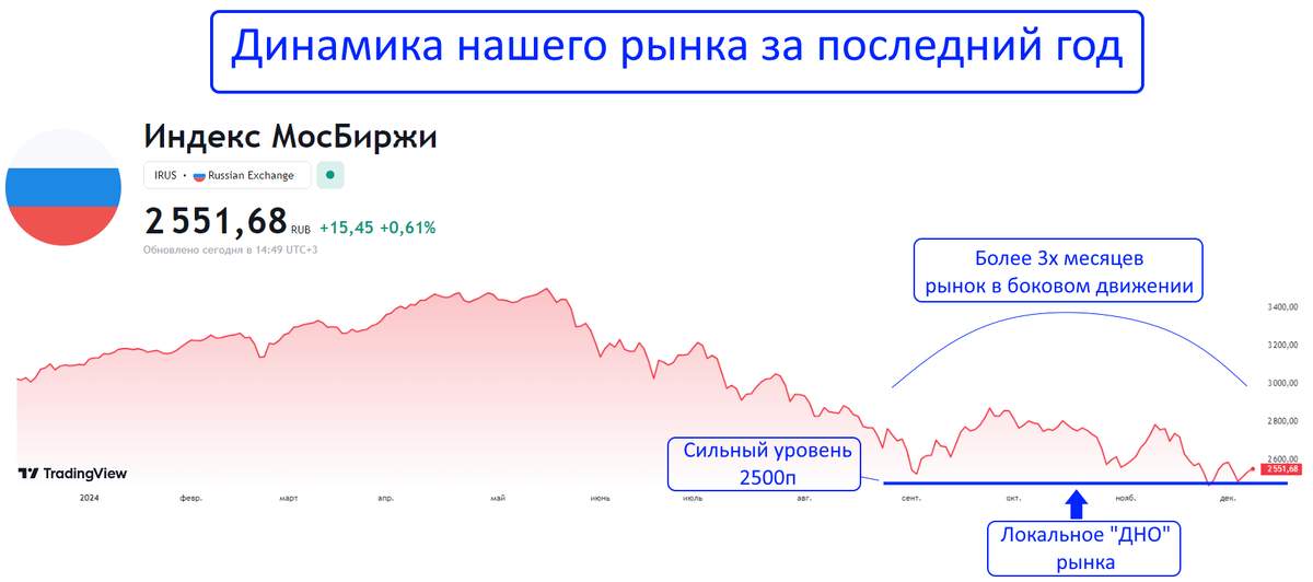 Сегодня получил очередную зарплату и инвестировал её в дивидендные акции нашего фондового рынка. Делаю так уже почти 5 лет, дважды в месяц часть доходов направляю на инвестиции и делюсь своими результатами на канале. В статье покажу свой инвестиционные портфель, а так же расскажу, какие акции я покупал. Индекс Мосбиржи держится выше сильного уровня в 2500п: Я считаю, что условного "дна" рынок достиг еще в начале осени и сейчас он ждёт позитивных драйверов для смены тренда и начала долгосрочного роста.