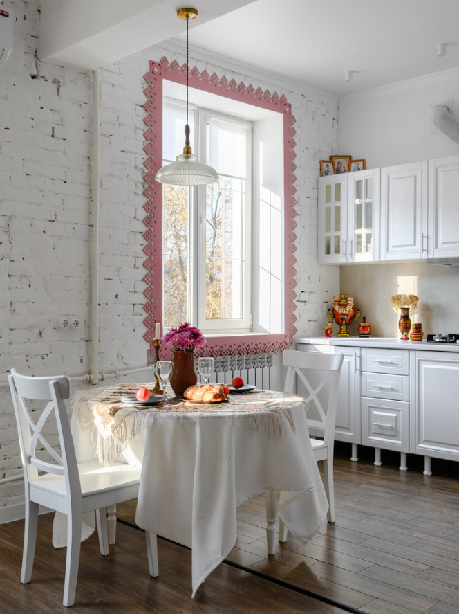 Сегодня мы идем в гости к Юлии Горловой — дизайнеру интерьеров, которая создала уникальное пространство в сталинской квартире площадью 53 квадратных метра. Дом был построен в 1958 году, и при реконструкции квартиры Юлия стремилась сохранить ее исторический характер, гармонично вписав как традиционные, так и современные элементы. В семье часто собираются гости, поэтому основное внимание уделили созданию просторной зоны для общения. При этом не забыли обустроить детскую комнату для двоих детей с рабочими местами и небольшой библиотекой. Перепланировка Юлия хотела создать открытое, светлое пространство, поэтому в квартире провели перепланировку, но при этом оставили оригинальные колонны в прихожей, ригель и кирпичные стены. Также объединили раздельные ванную и туалет. Кирпич оставили, чтобы подчеркнуть отсылку к старому времени. В этих кирпичах живет история, так зачем их прятать? Стены выкрасили в белый цвет, специально не реставрируя и не закрывая щели по углам. Гостиная Гостиная, совме