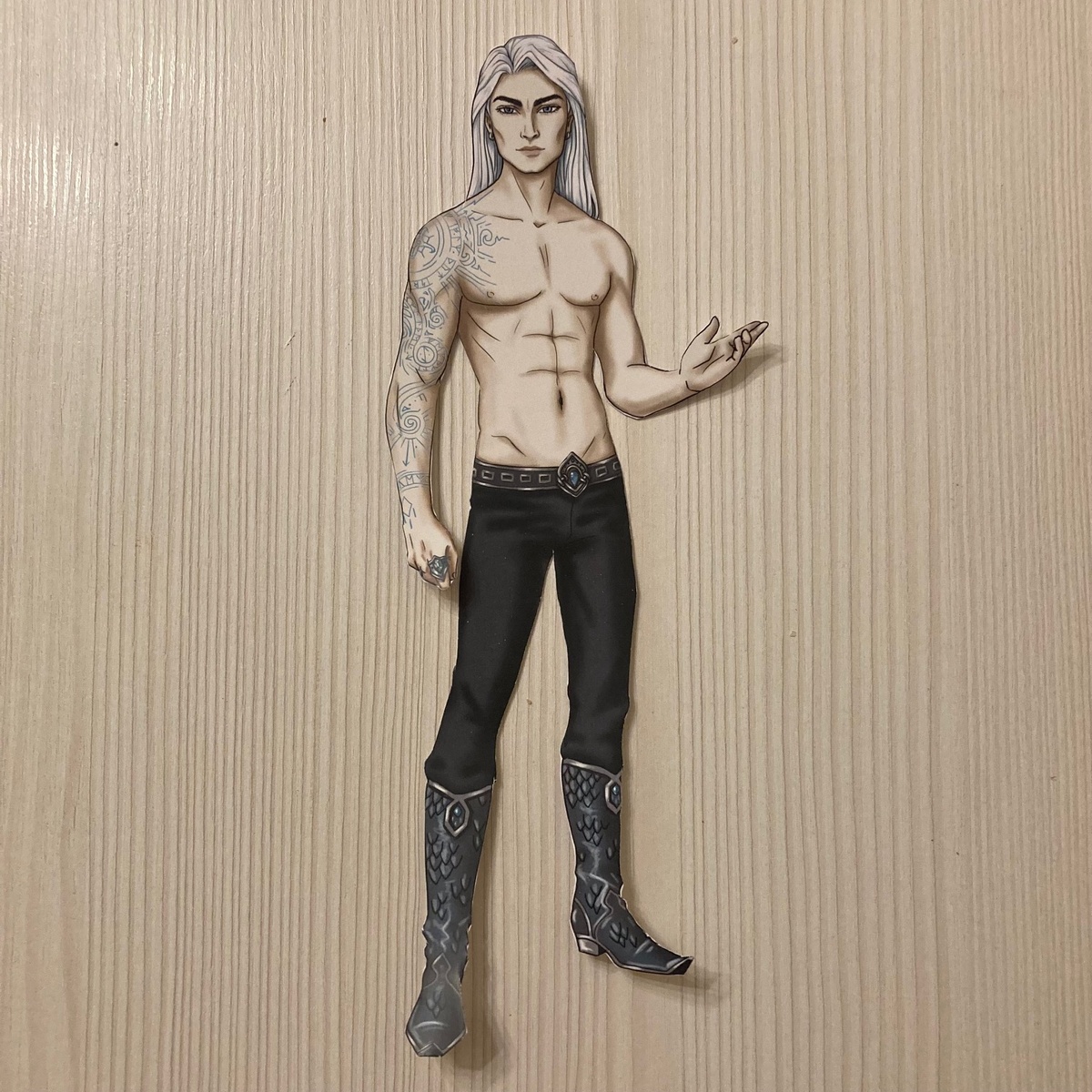 Добрый день! Ух, что я вам сегодня покажу! Вы, может быть, думаете: "Ну, Кощей и Кощей, зачем вообще такая кукла нужна? Ладно еще Иван-царевич..." Так вот, вы сильно заблуждаетесь, потому что Кощей этот нарисован (и переосмыслен) одним из моих любимых авторов бумажных кукол, Наталией Калашниковой. И в ее интерпретации выглядит он так: Эффектный товарищ, да? И ведь действительно, если задуматься, бессмертный же необязательно старый и дряхлый, просто не стареет. К Кощею прилагаются восемь нарядов, несколько причесок и уйма всяких аксессуаров. Все это крепится на магнитах, что очень удобно, так как не нужно мучиться с клапанами. У каждого наряда есть свое название, вот этот, например, озаглавлен "Утро в замке": А этот - "Лаборатория артефактора": К костюму "Тренировка в лесу" нарисованы две разные прически (листайте!): Дальше у нас "Путешествие в тридевятое царство": "Соколиная охота": Следующий костюм, "Тени мегаполиса" неожиданный, т.к. современный. Но ведь если Кощей бессмертен, значит